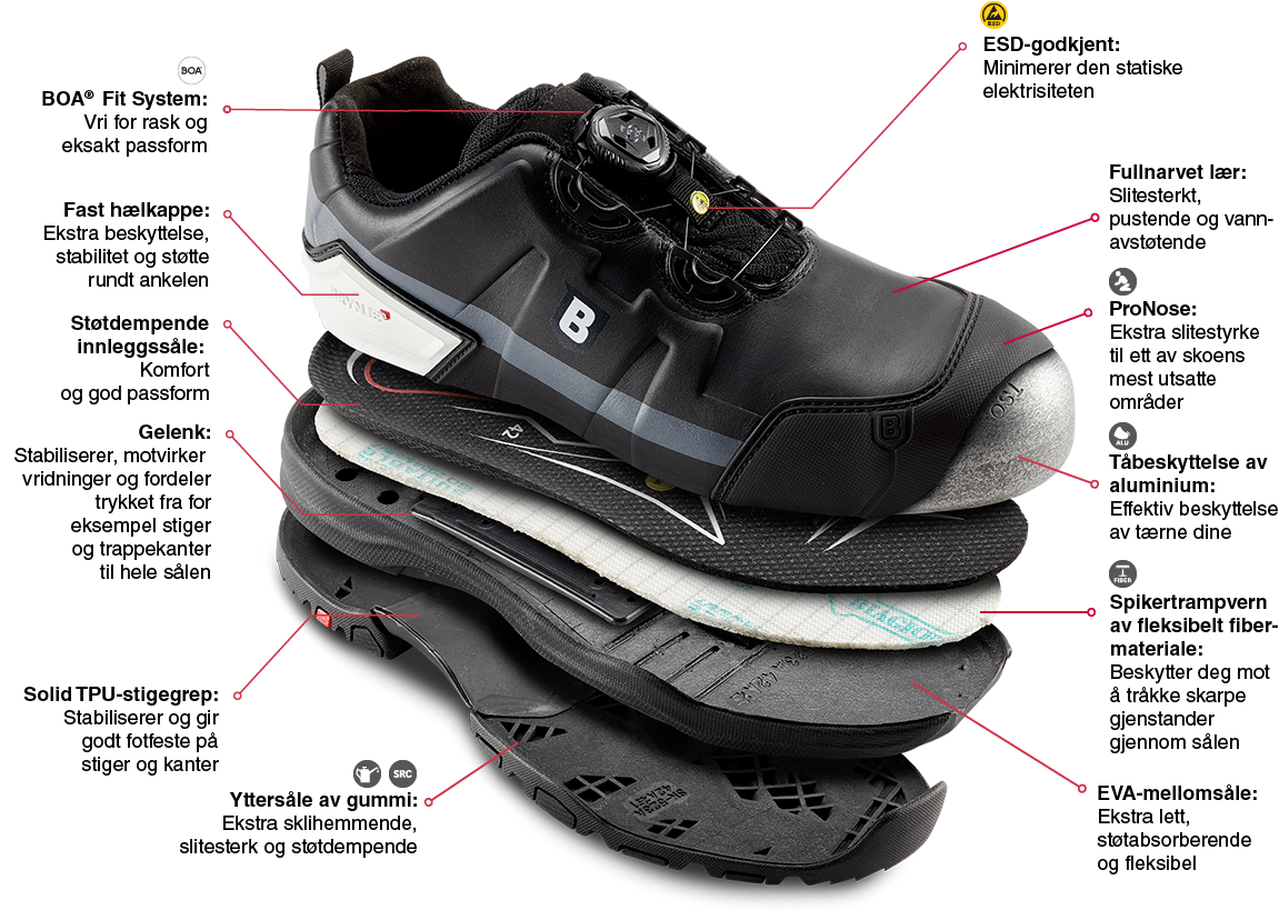 S3 / SRC / Tåbeskyttelse, alu / Spikertrampvern, fiber / Str. 35–48 / ESD-godkjent / Med BOA® Fit System